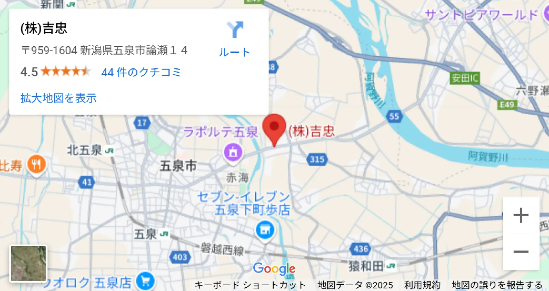 新潟県道41号白根安田線沿いラポルテ五泉すぐそば(早出川にかかる橋の近くです)社名:Car peak住所:〒959-1604 新潟県五泉市論瀬14番地TEL:0250-43-0066FAX:0250-43-3225会社案内アクセス問い合わせWEB審査フォーム